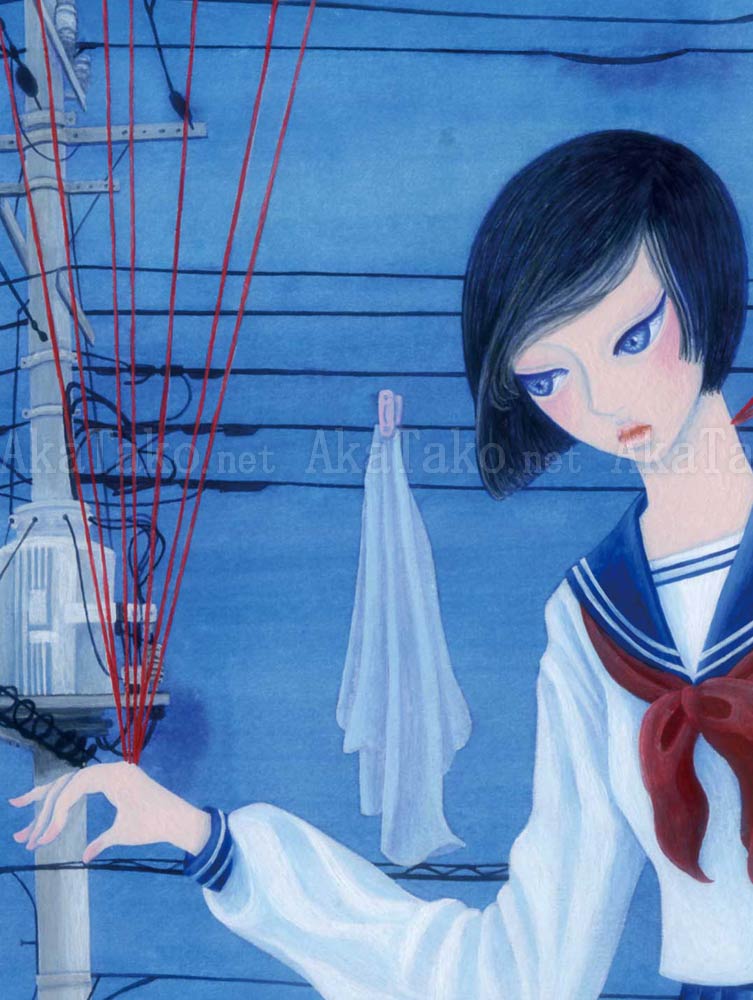Original painting by Chika Yamada of a very tall Japanese school girl being restrained by red wires. A tall electric pole stands behind her, holding some drying laundry.