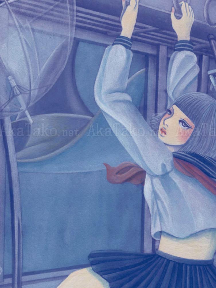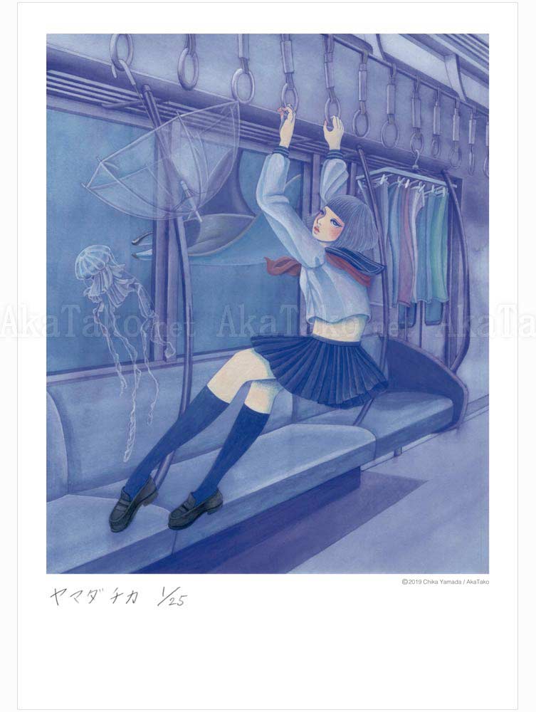 A schoolgirl floats inside a train car alongside a clear umbrella, a jellyfish, and some drying laundry. A large manta ray glides by outside the window. Brand new, original giclée print is hand SIGNED and NUMBERED limited edition of 25 pieces.