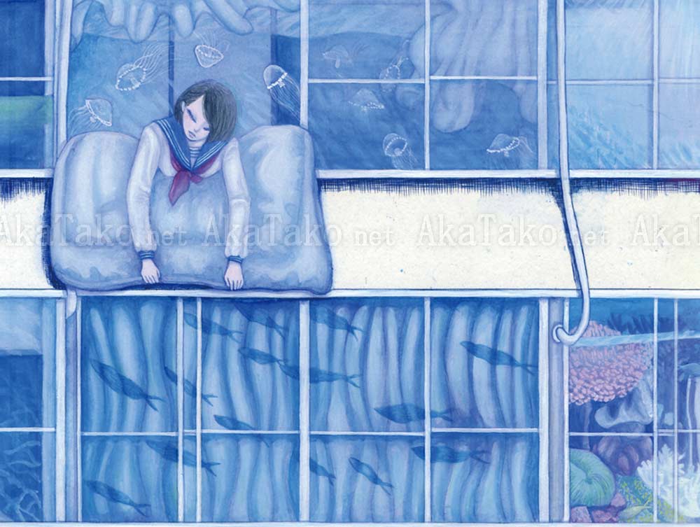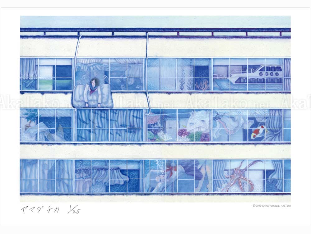 Three stories of windows give us a peek into a fantastic world of jellyfish, boats, schools of fish, schoolgirls, drying laundry, and even an octopus. Brand new, original giclée print is hand SIGNED and NUMBERED limited edition of 25 pieces. Was also reproduced in her "Hyou Hyou" book.