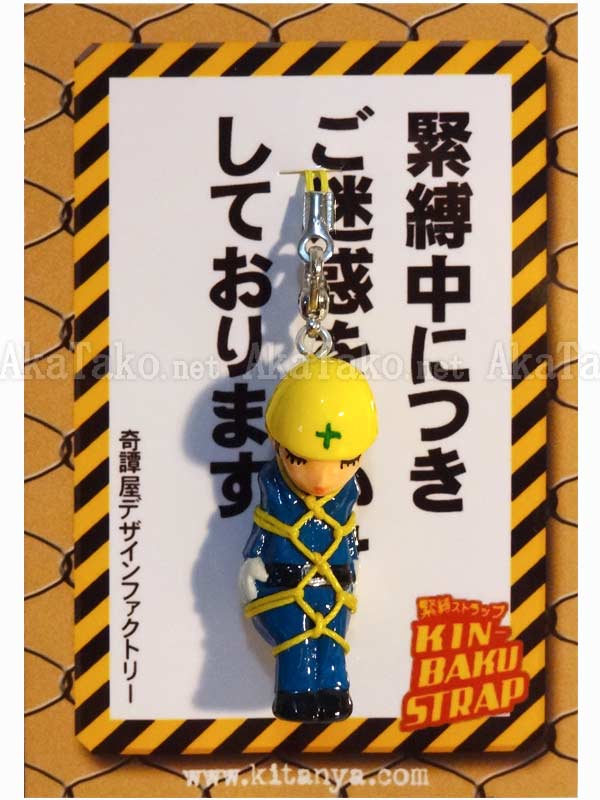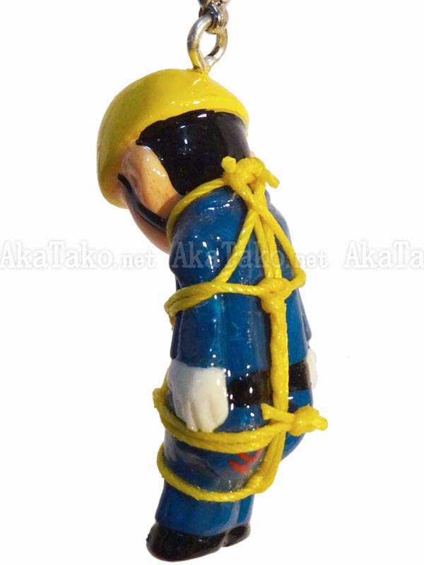 Caught in mid-bow as if apologizing for the inconvenience, the Japanese construction worker wears his blue uniform with clean white gloves and yellow safety helmet. Kinbaku cell phone strap handmade in Japan and signed by the artist (in red on back). Comes on a paper display card as shown in second photo and has a lobster claw clasp to make attachment easier.