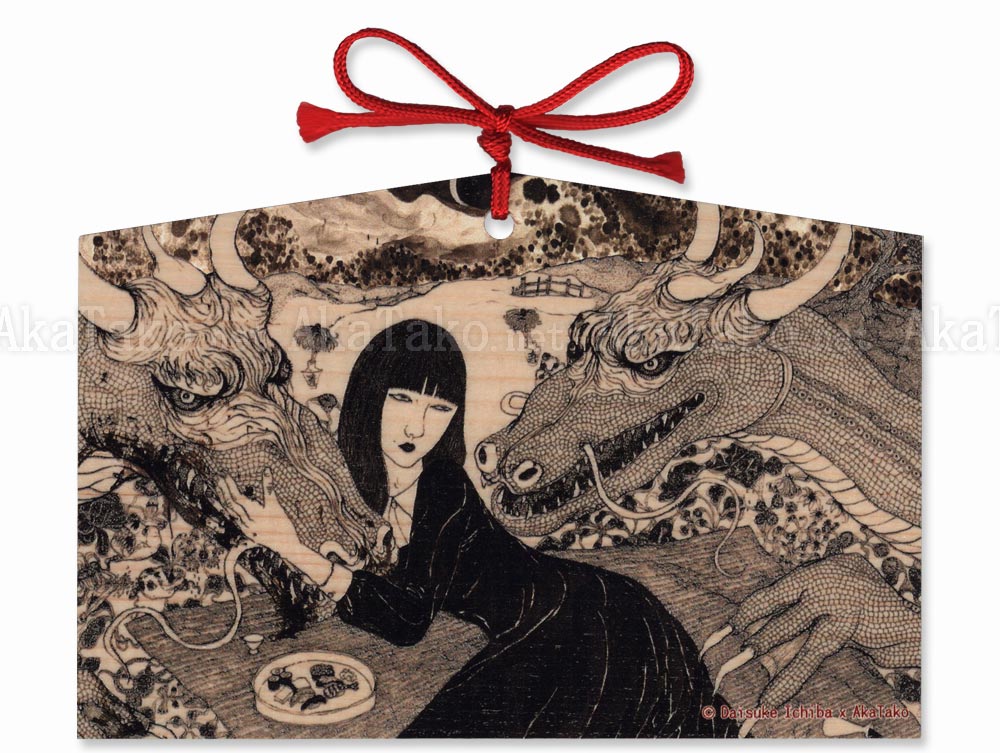 EMA 1: monochrome print of a girl in black dress with large dragon on each side.
