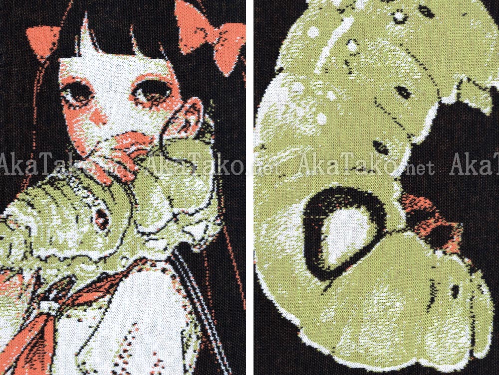 Special collaboration between Em Nishizuka and AkaTako.net ! Fine cotton scarf is knitted (not printed) with different Em Nishizuka artwork on each side. One side is a girl wearing a Daphnis nerii caterpillar as a scarf, the adult oleander hawk-moth in the center, and big caterpillar on the other end. The second side is is a girl wearing a Papilio glaucus caterpillar as a scarf, the adult eastern swallowtail butterfly in the center, and big caterpillar on the other end. Both girls originally printed in her "Portrait 3" book.