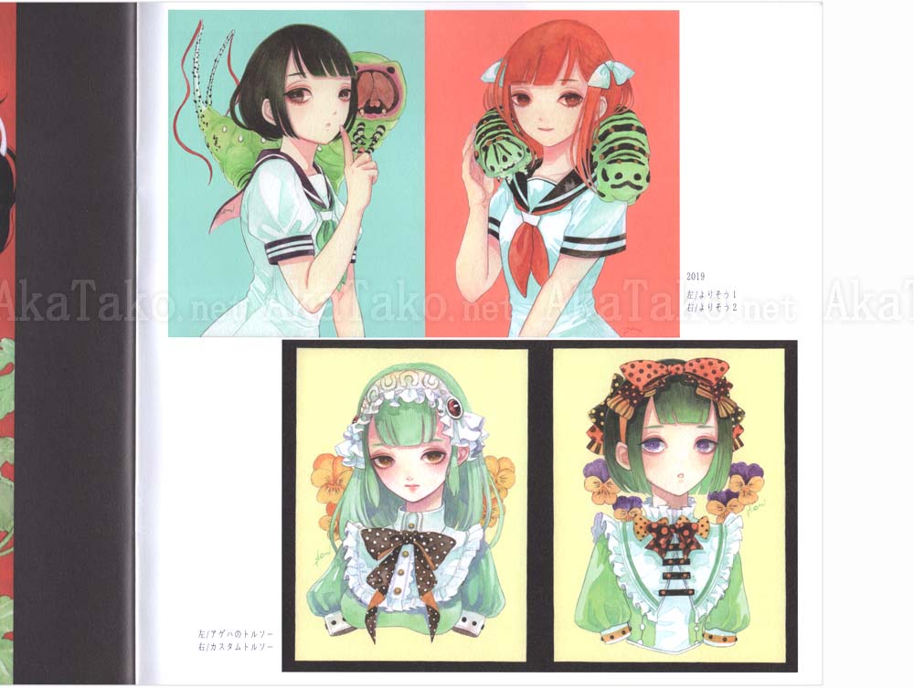 Brand new book of Em Nishizuka artworks with girls and boys adorning their bodies and clothes with insects. Hair ornaments, earrings, and the favorite caterpillar scarf. Approximately 30 full color illustrations.