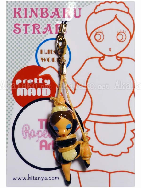 Brunette French maid is dressed and ready to get to work. She'll clean up any mess you can make just as soon as you untie the Japanese rope bondage holding one of her legs in the air. Kinbaku cell phone strap handmade in Japan and signed by the artist (in red on back). Comes on a paper display card as shown in second photo and has a lobster claw clasp to make attachment easier.