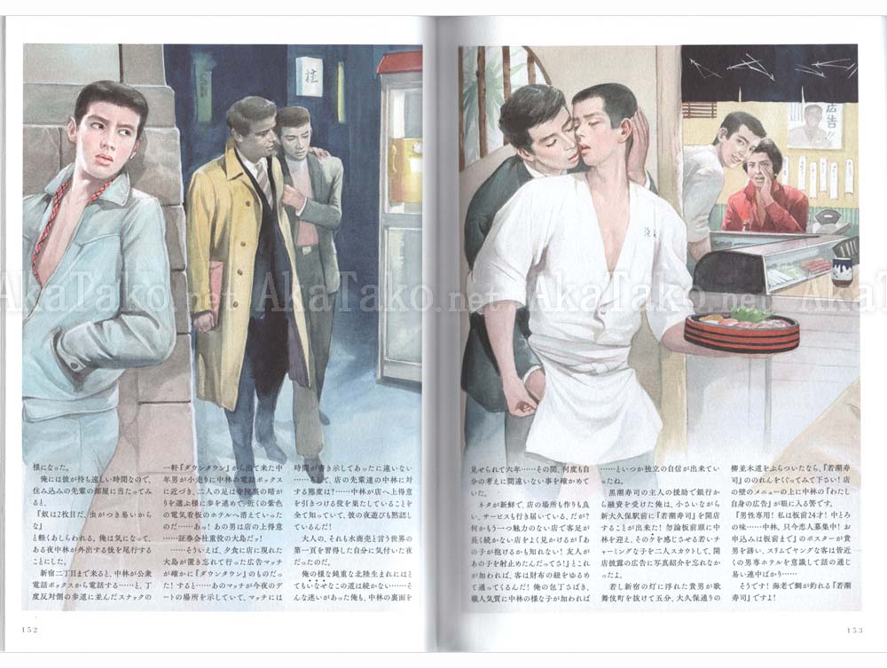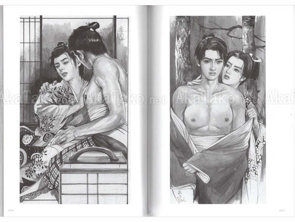 Book is divided into eight sections: Play Mate, Kinky Chic, Muscle Man, Erotic Fantasia, Mature Love, Samurai Love, Gekko Theatre, and Homme Fatale. Gekko Theatre includes illustrations of real-life stories which he collected from a telephone hotline he set up at his workplace to hear readers' experience and give consultation (Japanese text only).