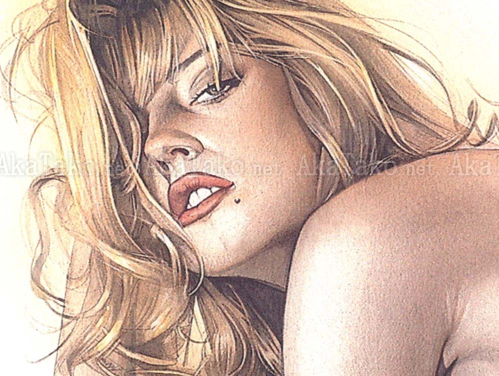 High quality giclée print of a blonde woman wearing only high heels and some golden cord that ties her legs. Her nipple is pierced with a golden ring and a few strands of fine gold chain. Printed on very heavy weight paper (almost 1mm thick!) with hand deckled edges. Print paper is pure white with a border surrounding the printed image. Originally printed in the late 1990s, these have been in storage for a long time.