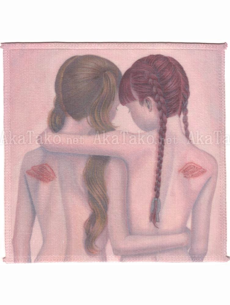 Born with One Wing: 片翼で生まれてきた is light pink with two girls who have an outline of a single wing sewn on their shoulder.