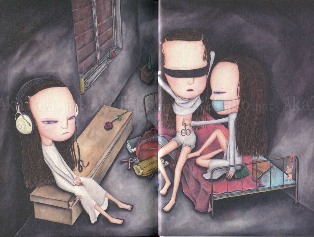 Kenichi Koyama paints a world entirely populated by very sad girls. They hang out in the hospital together and console each other. They play music and games together, reaching inside each other's skirts as if looking for something. The girls are often hurting themselves with scissors or staring into space with downcast eyes.