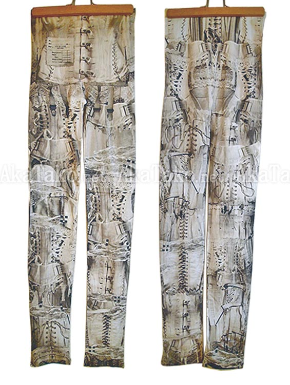 Footless tights featuring vintage medical corsets are a design collaboration between Lhiannan and Shee. All of the straps, buckles, and laces you could ever hope to fit on your legs! Gray-scale tone. Can be worn frontwards or backwards.