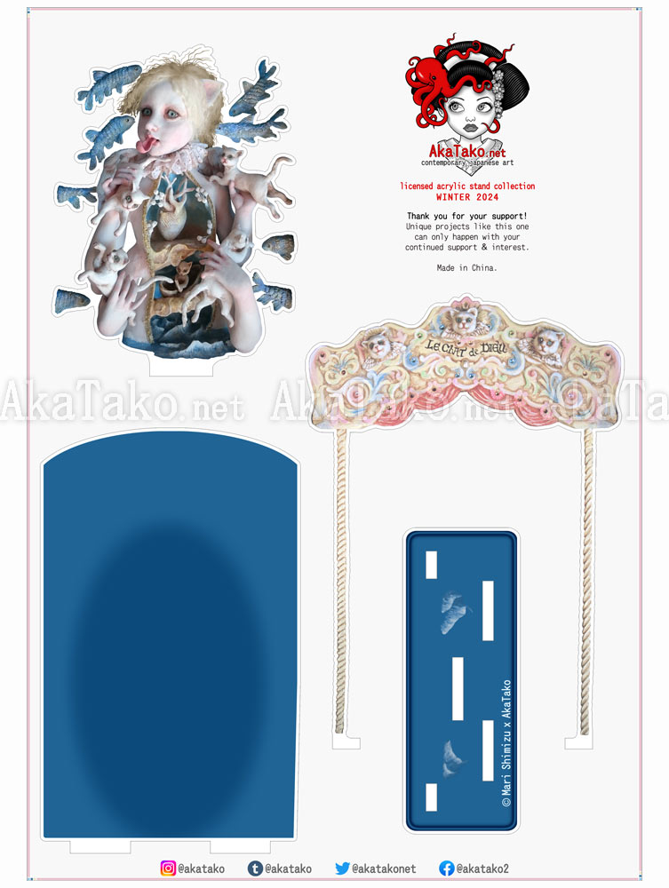 Special collaboration between Mari Shimizu and AkaTako.net ! Clear acrylic art stand assembles to display your favorite artwork in a 3D layered form. "Cait Sith" artwork first published in "Wonderland" book.