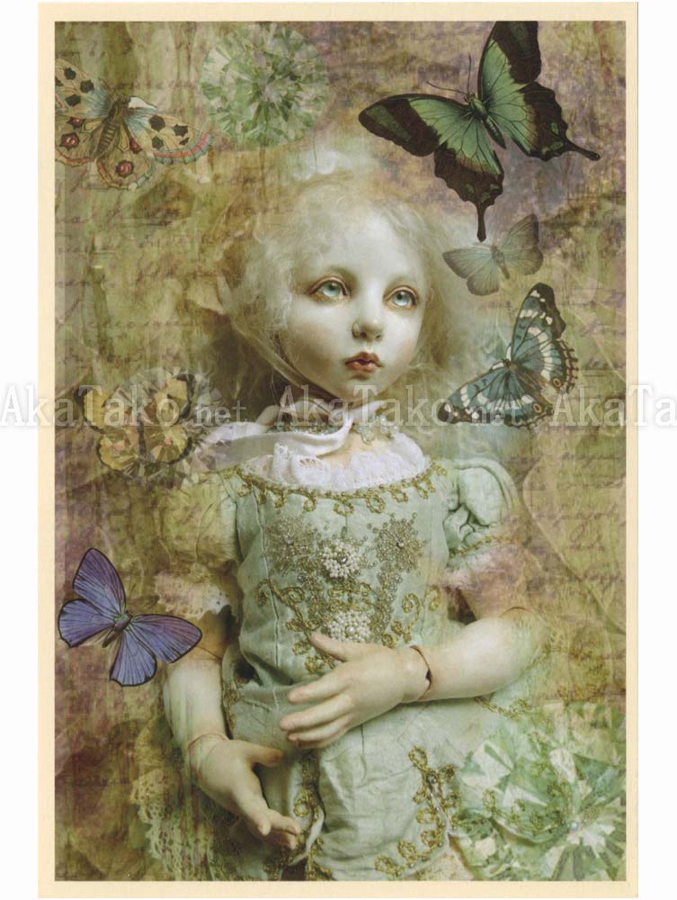 Set of four postcards by Japanese contemporary doll maker Mari Shimizu. Each card features a beautiful fantasy doll - a merry-go-round girl in pink, a girl with her torso cut open to reveal a doll inside, one in pale shades with butterflies, and a nude girl with butterfly wings.