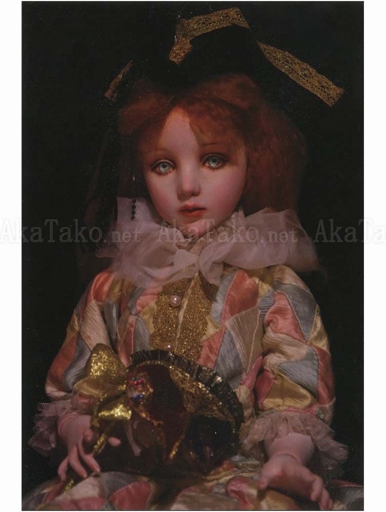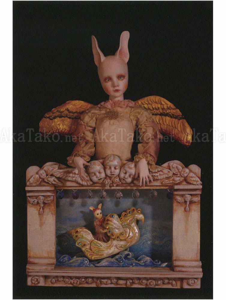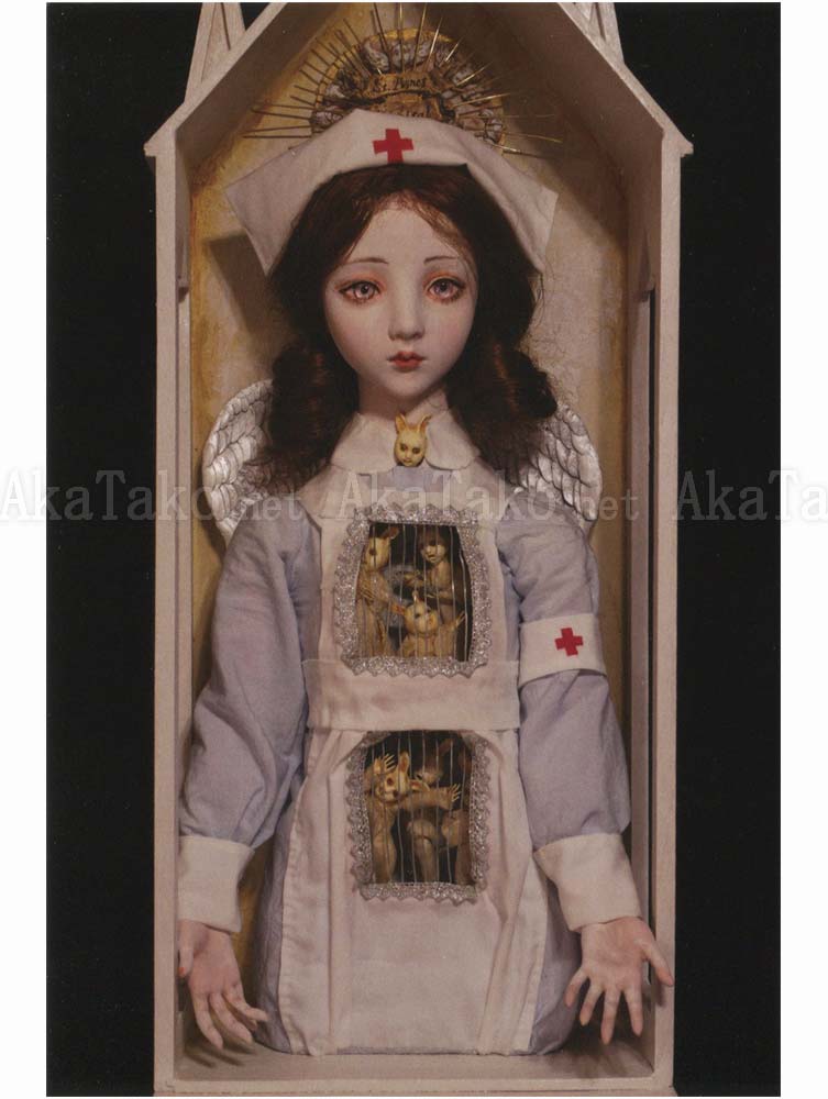 Set of four postcards by Japanese contemporary doll maker Mari Shimizu. Each card features a beautiful doll - one in a nurses uniform with cages in her torso, one holding a mask and wearing a jester's satin outfit, and two of winged dolls presiding over a dimensional shadow box scene.