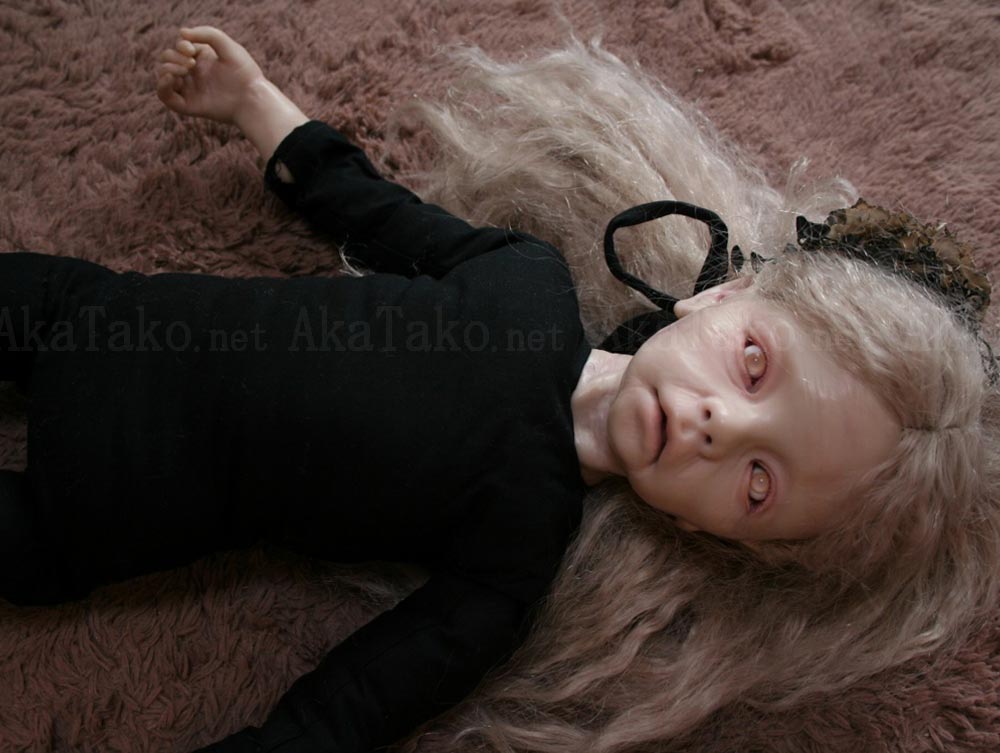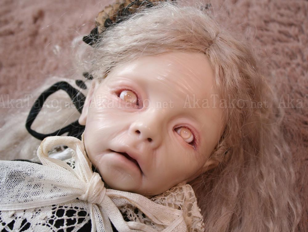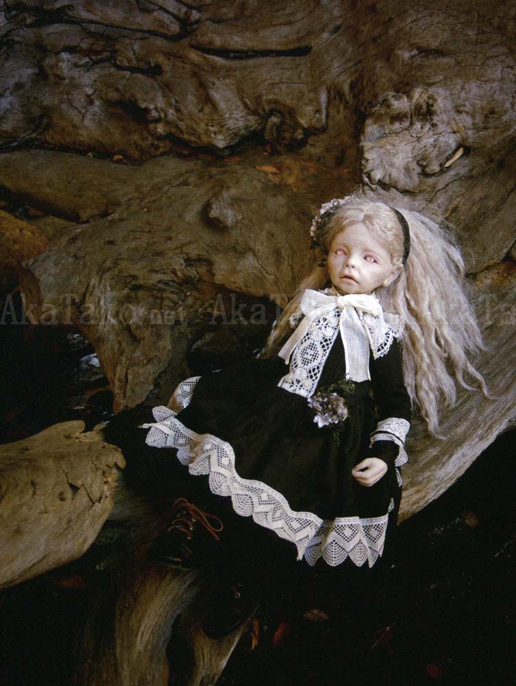 Original, handmade doll by Midori Hayashi. "Ashley" has long, ash-blonde hair and hauntingly pale eyes. Her head, hands, and legs are made of cernit (polymer clay) with part of the head made of stone modeling clay. Body is cloth, cotton, and wire. Hair is human, eyes are glass, and the doll is finished with acrylic paint. Dress and hat are included with the doll.