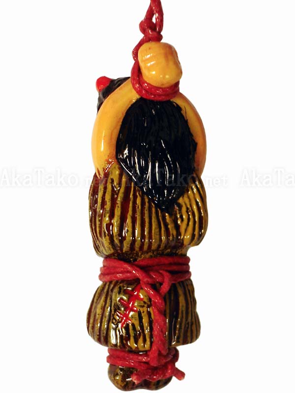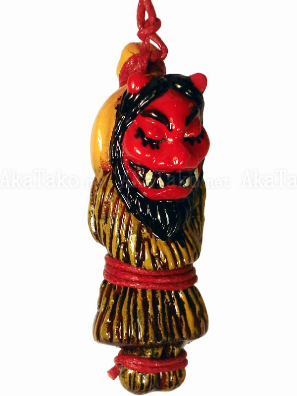Traditional Japanese demon Namahage is tied up in rope bondage and suspended from his hands. Kinbaku cell phone strap handmade in Japan and signed by the artist (in red on back). Comes on a paper display card as shown in second photo.