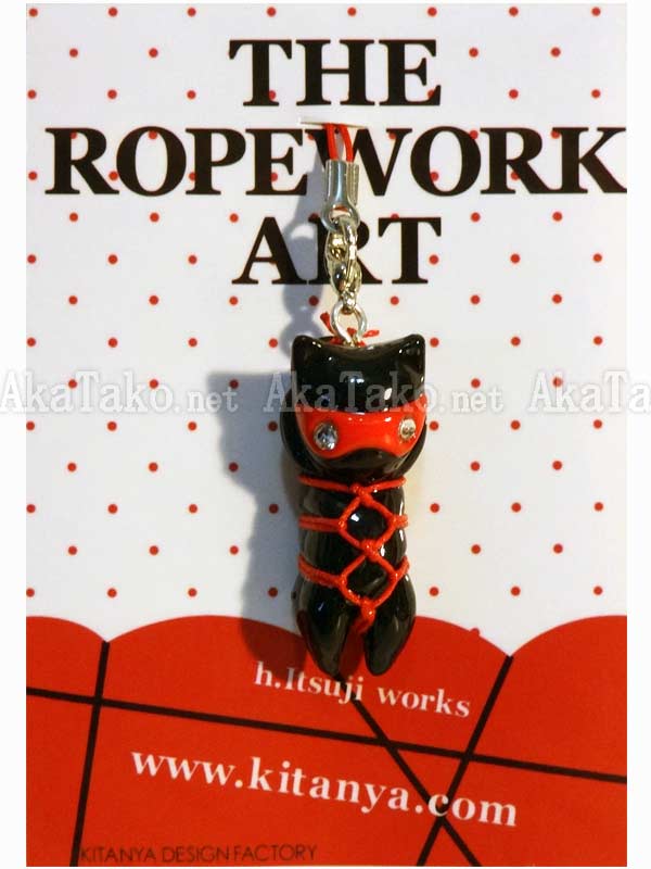 The black cat is always lucky in his red mask and karada pattern Japanese rope bondage! Kinbaku cell phone strap handmade in Japan and signed by the artist (in red on back). Comes on a paper display card as shown in second photo and has a lobster claw clasp to make attachment easier.