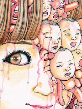 Brand new original painting by Shintaro Kago of a girl who has little tiny baby faces and appendages squeezing out of her skull and chest. She stands in front of a pink geometric wall and her hat has an interesting meat-like interior.