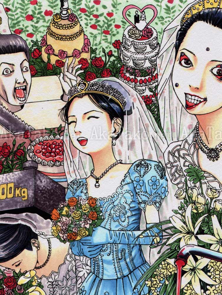 Brand new giclée print of "Bride in Front of the Station" by Shintaro Kago. Such a joyful day in a woman's life, the brides in this print are ready for their day - decked out in lace and veils they saw off the groom's head, have their faces bolted into happy expressions, and are ultimately hosed off by a fire brigade.