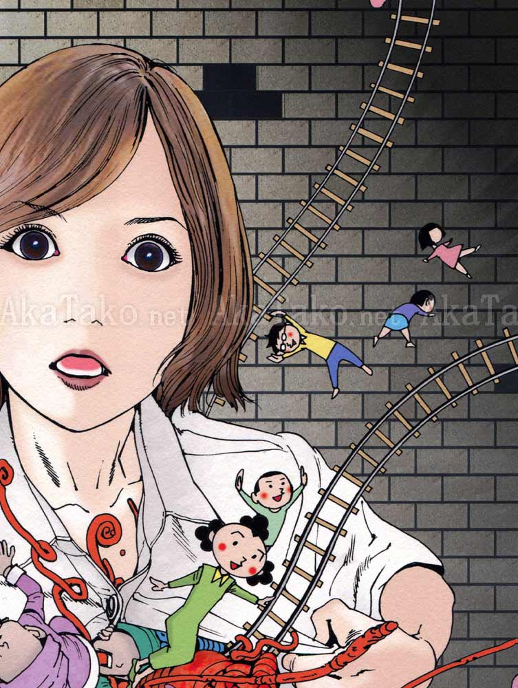 Brand new giclée print of "Murder Art Through the Ages" by Shintaro Kago. A surprised girl pulls at her shirt as a cheerful explosion of train tracks, teddy bears, miniature people, and curly entrails bursts forth.