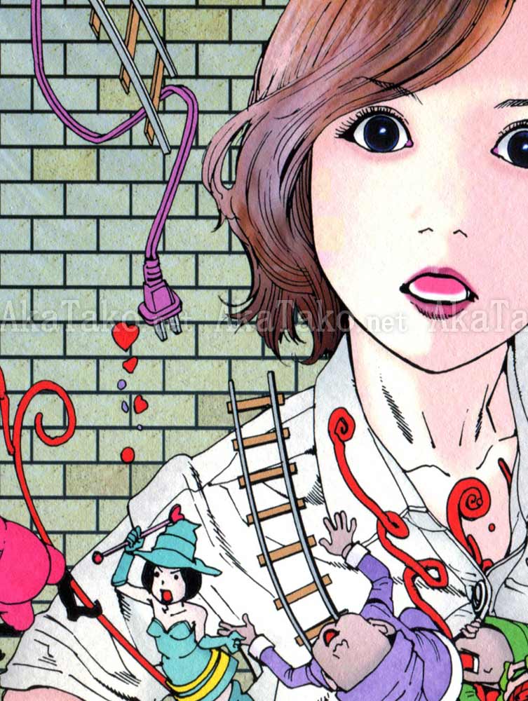 Brand new smaller sized giclée print of "Murder Art Through the Ages" by Shintaro Kago. A brown haired girl stands in front of a brick wall as her torso explodes with teddy bears, magical fairies, trains, and toys.