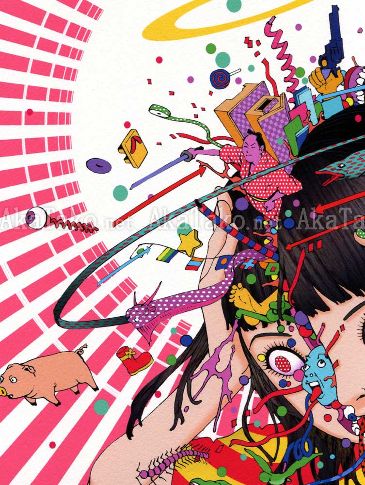 Brand new giclée print of the VICE Magazine illustration by Shintaro Kago. A girl in a bright yellow and red kimono attempts to squeeze her splitting skull back together. Try as she may, her head still explodes with polka dot eels, fantasy creatures, eyeballs, spinning arrows, and a pig.