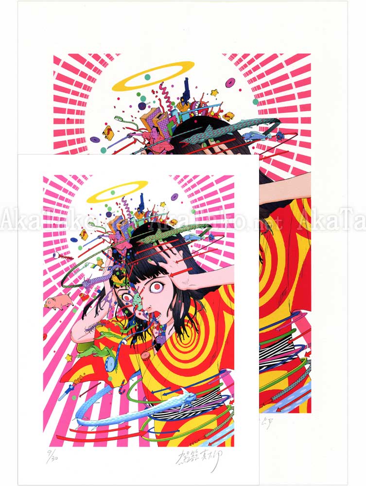 Brand new smaller sized giclée print of the VICE Magazine cover illustration by Shintaro Kago. A dark haired girl tries hard to keep her crazy thoughts to herself but can't stop them from bursting out of her head.