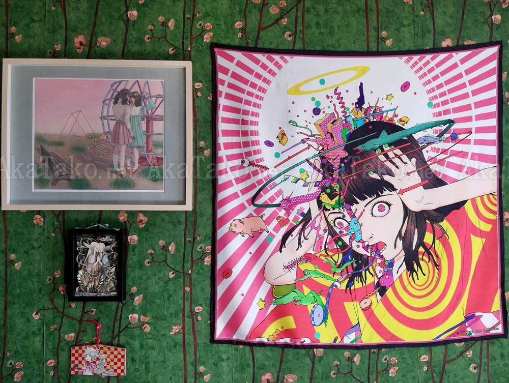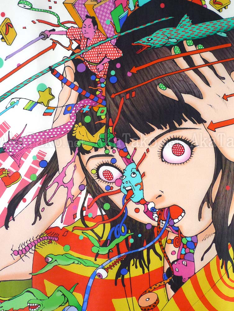 Special collaboration between Shintaro Kago and AkaTako.net ! 100% silk art scarf featuring Shintaro Kago's iconic VICE artwork (first published on the cover of VICE magazine). A girl wearing kimono with red and yellow circles tries to hold her head together as it splits vertically down the center. Brightly patterned items spill out as a yellow halo floats above and pink-orange rays stretch toward the edges.