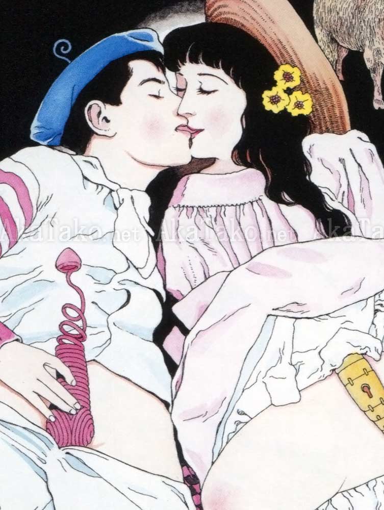 Original painting by Suehiro Maruo was designed for a CD jacket. A young couple kisses and unsuccessfully tries to resist the temptation to lift their skirt and drop their pants. A skeletal figure hooks the girl's leg and tries to help out. Three sheep cuddle in the background as the sun sets.