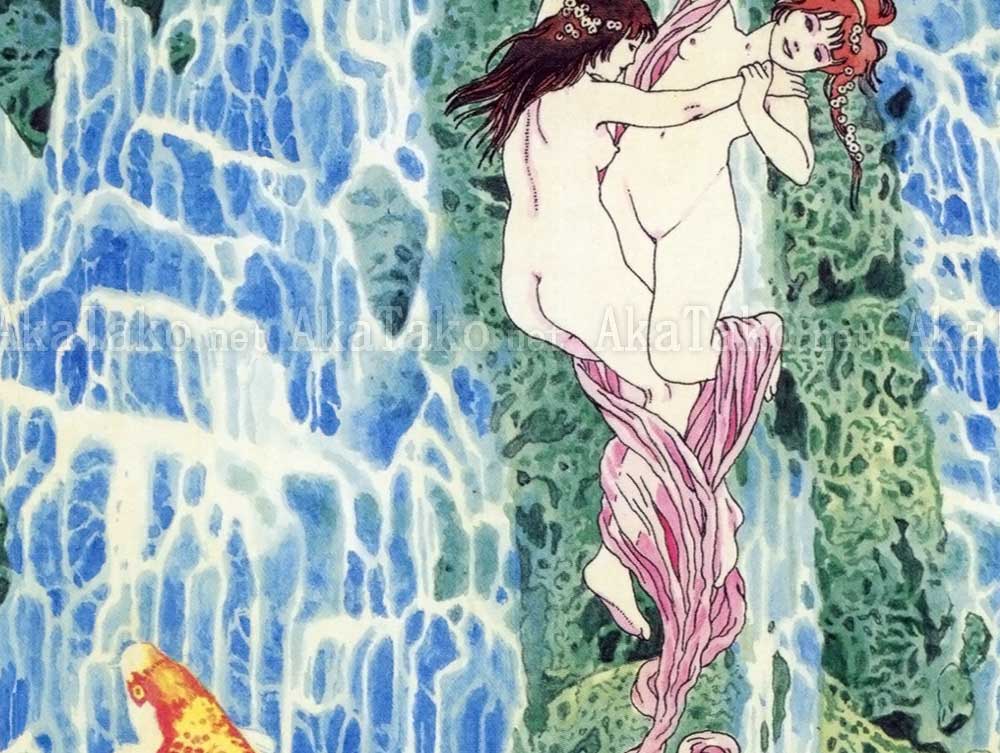 Original painting by Suehiro Maruo of a sparkling waterfall and lush greenery. A boy in a white uniform looks up towards the water. Two nude women float in the top center and a large nude woman lays across the entire painting. A koi fish swims beneath the falls.