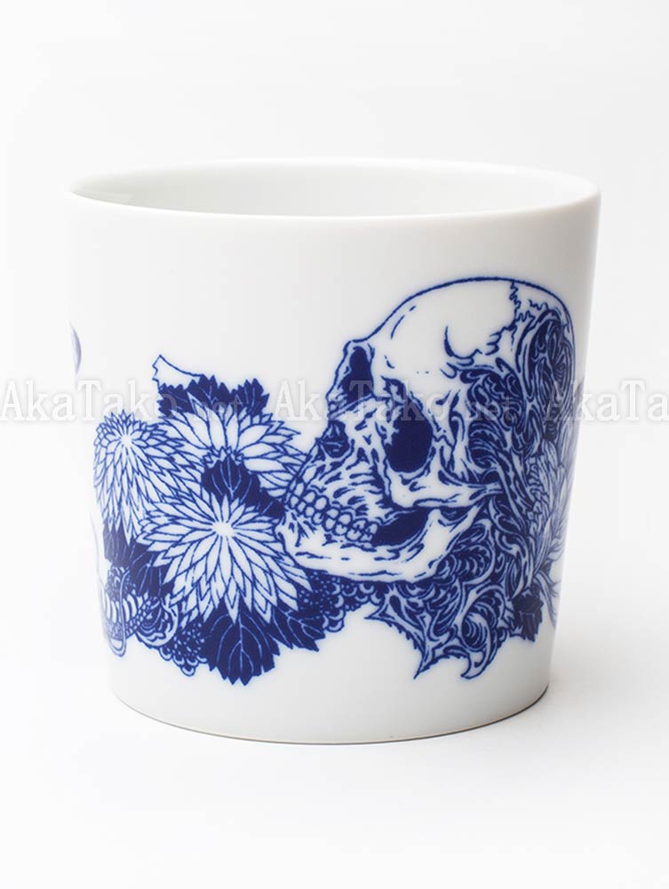 Porcelain cup with indigo design by Takato Yamamoto. Two skulls rest on a bed of chrysanthemums and look skywards at a passing butterfly. Made of high quality Amakusa kaolin clay local to Kumamoto prefecture. Amakusa porcelain is renowned for its high quality. Cup was made as part of the CREATION Project 2016.
