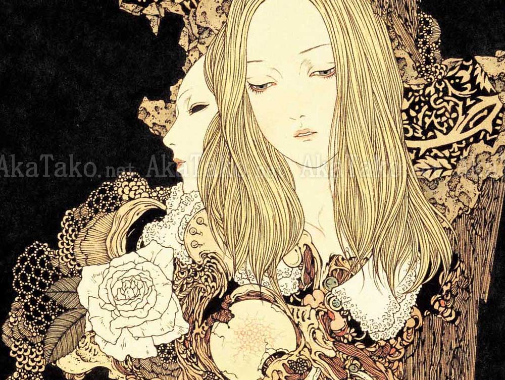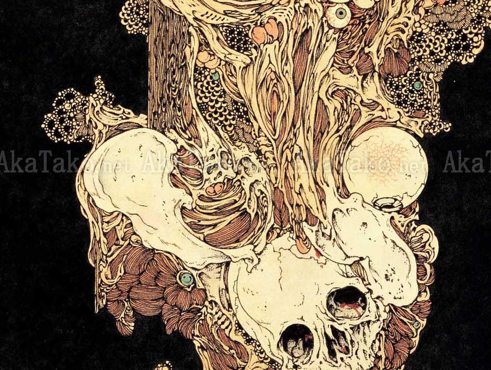 Original painting by Takato Yamamoto "Calling – A Voice Calling from the Darkness". Originally printed in the "Rib of a Hermaphrodite" book. A pillar of sinew, bones, skulls and beauty looms out of the darkness. A girl with long blonde hair and a lace collar, half a rib cage, a white rose, a pelvis, an eyeball or two and a skull combine with intricate floral designs.