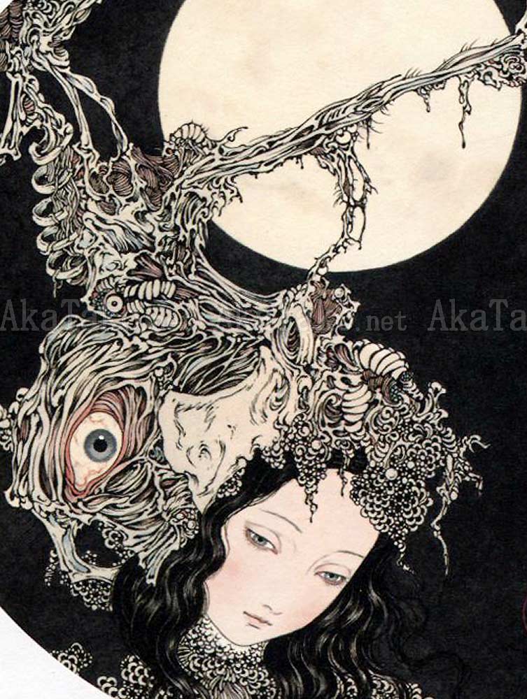 Original painting by Takato Yamamoto "Moon – Drunken by moonlight, melancholic, sinking into the bottom of a mirror, a honey-colored poisonous insect". Originally printed in the "Coffin of a Chimera" book. The head of a girl with long black hair is being overtaken by a sinewy being with one large eyeball, exposed rib bones, and several small rows of teeth. A large full moon looks on in the dark of night.