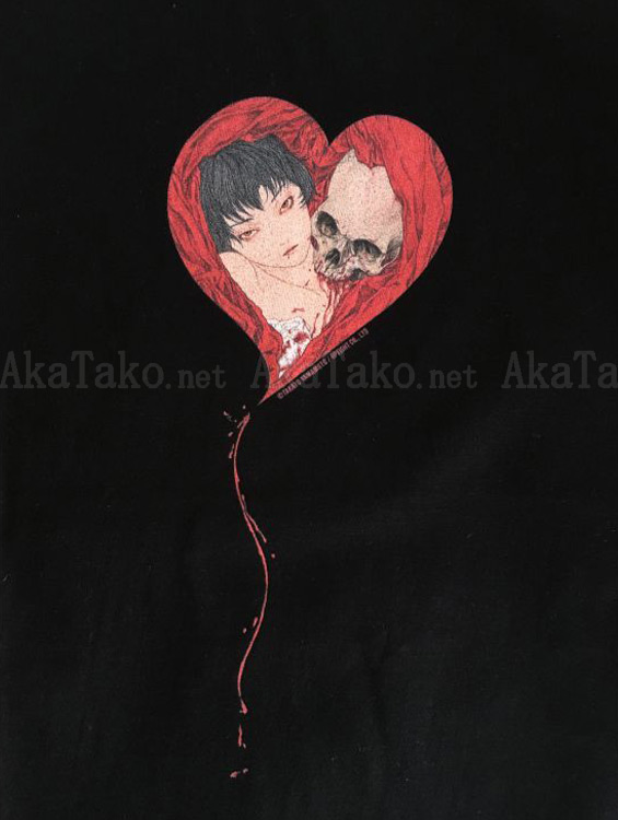 Graphic t-shirt produced for the exhibition of Takato Yamamoto's latest book "Nosferatu". Black t-shirt features "Red Sheets" in a heart shape with a long trickle of blood dripping down.