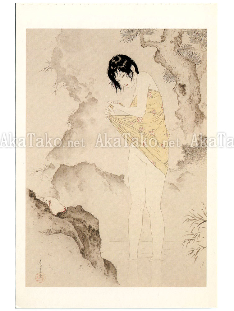 Painting of Bathing 水伐図 - a young girl ankle deep in water, wringing out the hem of her dress, with a severed head peeking out from the rocks on the left.