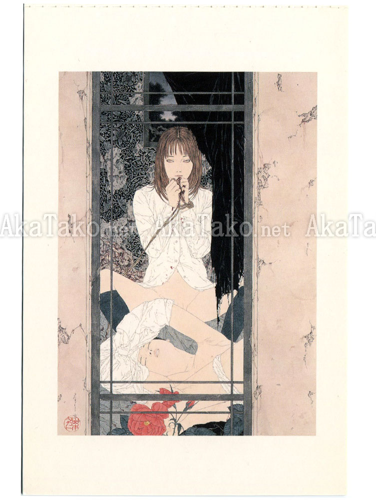Set of postcards from Takato Yamamoto's book Allure of Pharmakon is a little book with 8 postcards in it. They are perforated along the shorter edge so that you can tear them out of the book if you'd like. And there's a black OR red tassel hanging from the lower left corner of the book. The book measures approximately 6.5" x 4" but the postcards are very slightly smaller at 4" x 6".
