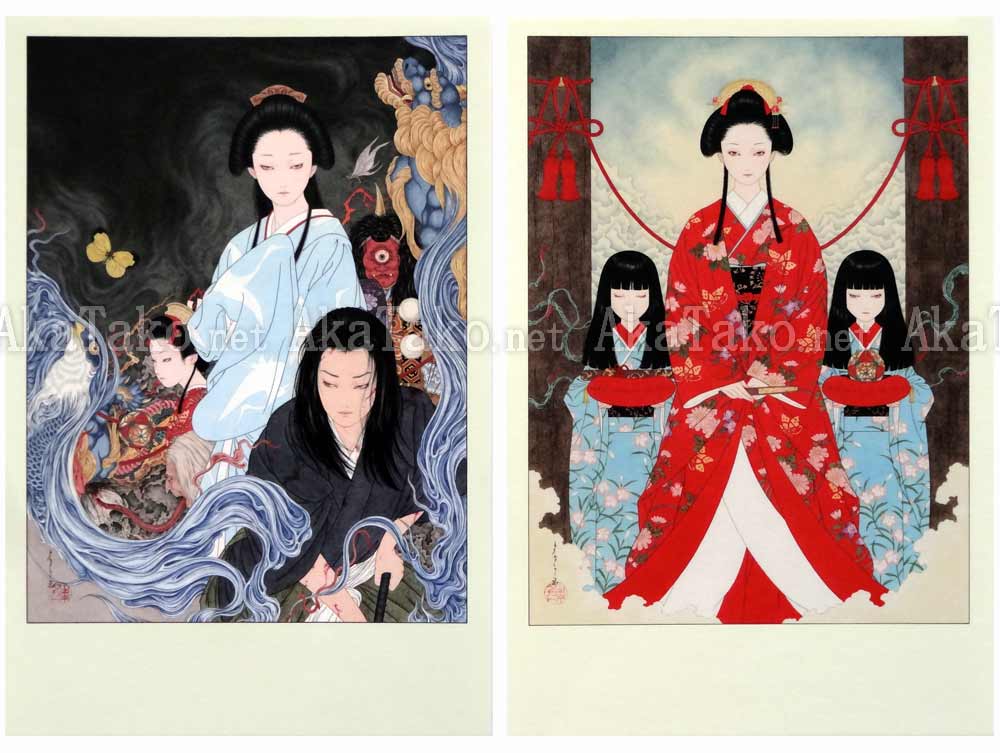 Set of six postcards featuring artwork from "Tale of a Castle Keep". Artwork titles are: Tale of a Castle Keep I, Princess Kame Mistress of Inawashiro Castle of Maya County in the Land of Iwashiro, Five Ladies-in-Waiting Angle for Autumn Blossoms from the Fifth Story of the Castle Keep, Princess Tomi and Princess Kame Play with the Brocated Ball, Phantasmagoria of the Castle Keep, Tale of a Castle Keep II.