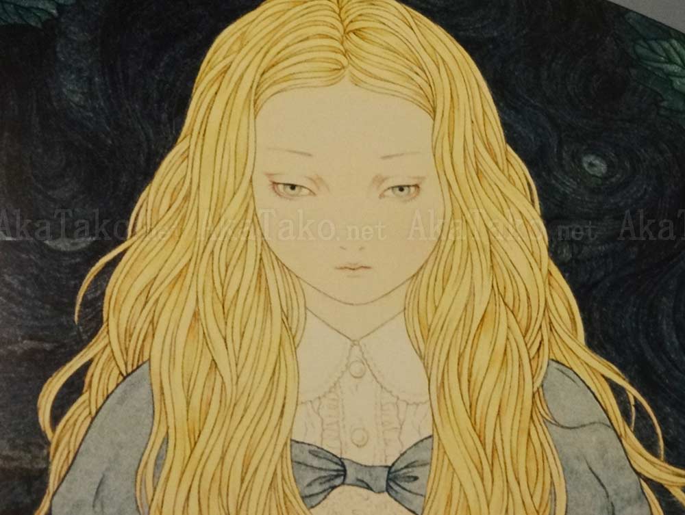 Brand new poster featuring "Alice's Choice" by Takato Yamamoto. A blonde girl sits on the forest floor with plants reaching in towards her. She stretches her arms towards a red mushroom in front of her. This painting was originally published in the "Coffin of A Chimera" book. Border is a soft blue color and is SIGNED by Takato Yamamoto in gold marker.