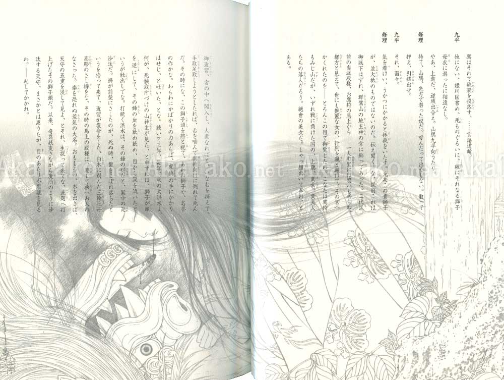 Bilingual book illustrated by Takato Yamamoto and Aquirax Uno celebrates the 100th anniversary of Kyoka Izumi's famous play "Tale of a Castle Keep" (Tenshu Monogatari). Izumi's modern fantasy adventures inspired many other famous writers including Akutagawa, Tanizaki, Kawabata, and Mishima.