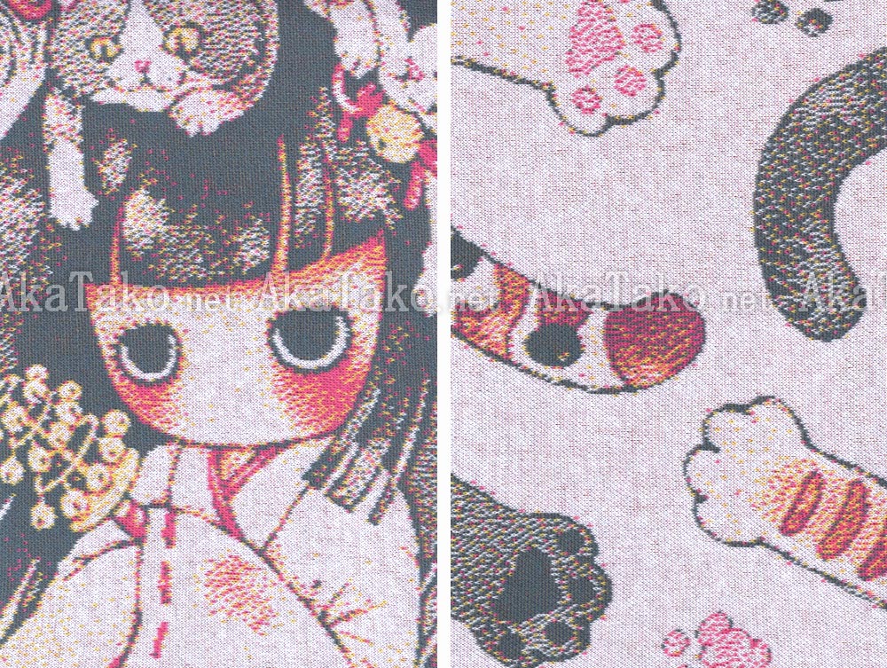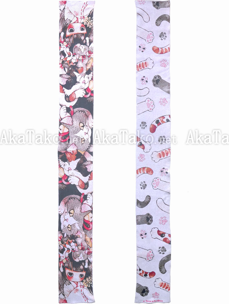 Special collaboration between Tama and AkaTako.net ! Fine cotton scarf is knitted (not printed) with different Tama artwork on each side. One side is a Shinto priestess holding bells with a pile of cats sitting on her head, ready to play. Printed as a postcard. The second side is a white background with cat arms, tails, and paw prints reaching in (painted specifically for this scarf!).