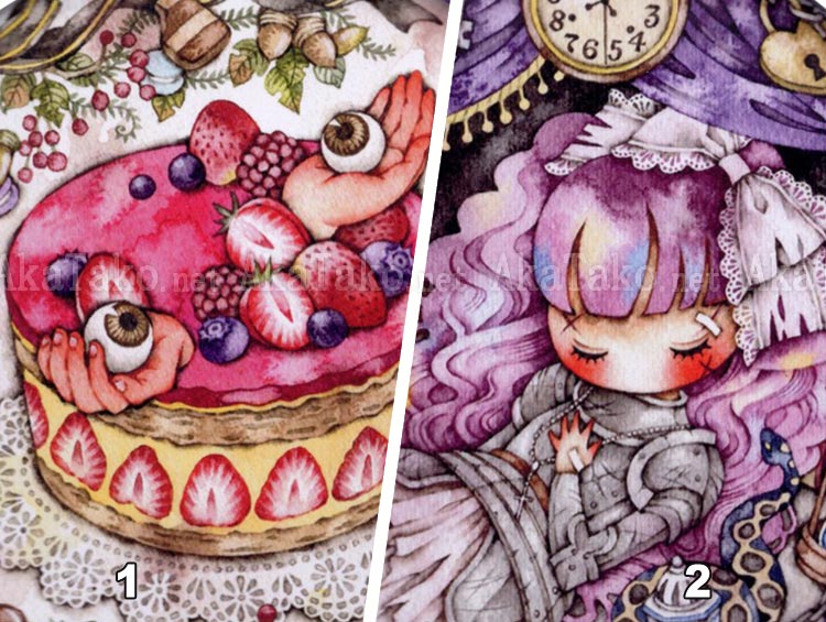 A gorgeous strawberry cake sprouts two hands tenderly holding eyeballs. Surrounded by ribbons, acorns, and cookies.