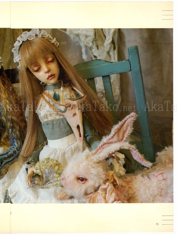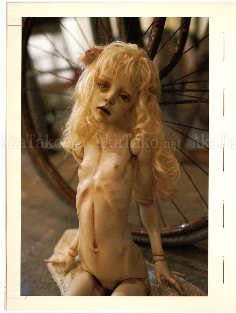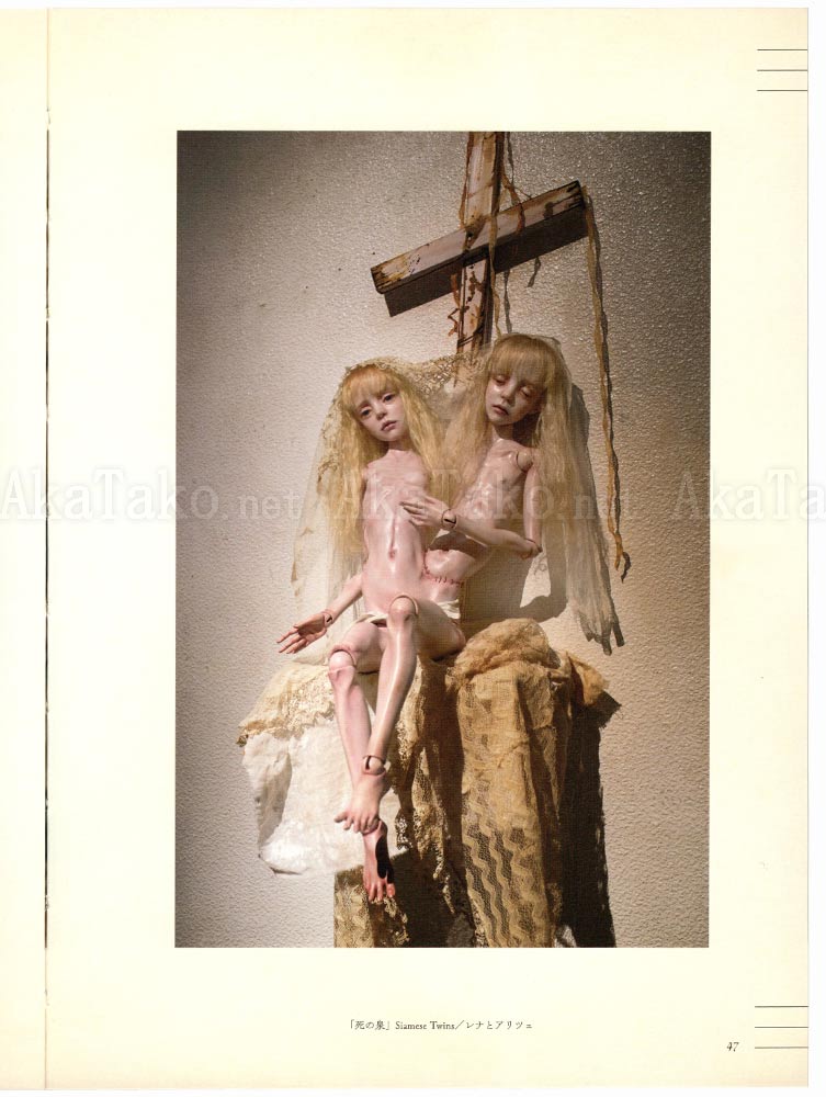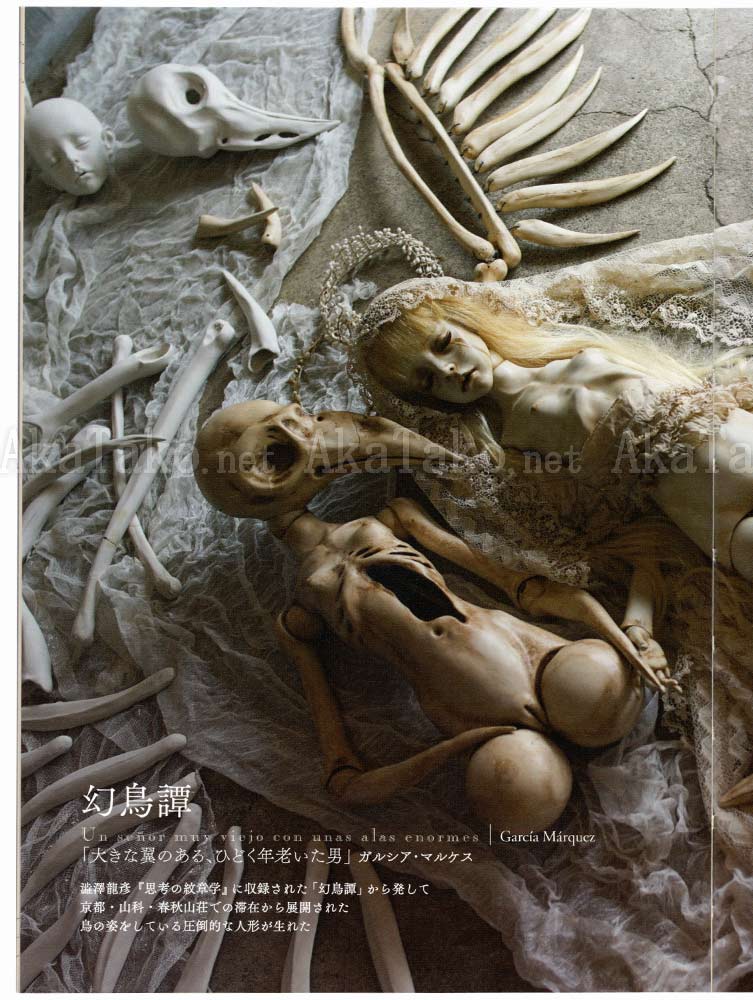 Book is unique with a mesh fabric and paper dust jacket and exposed binding. In addition to the excerpts within the photos, includes essays by Shinozuka Korechika, Higashi Masao, Akihito Morishima, and Yuko Yamao; notes on the stories by both the artist and the editor; a list of all dolls in the book; and an exhibition list. Text is 100% Japanese.