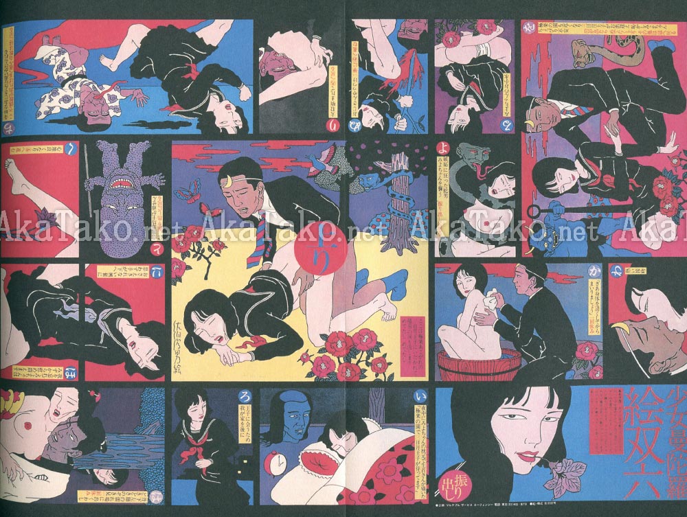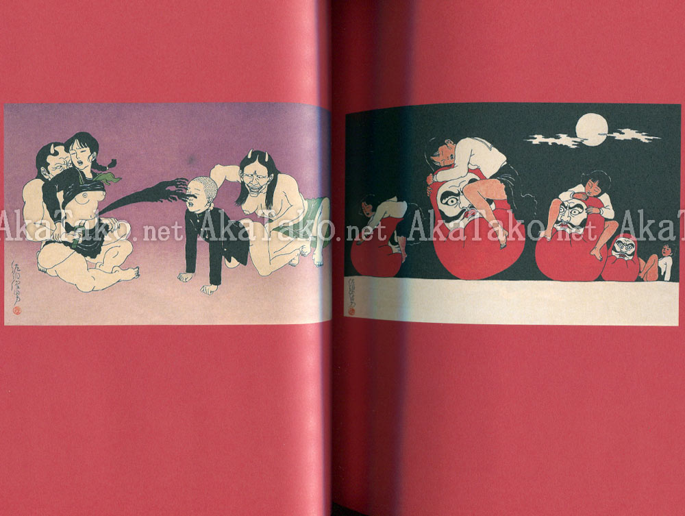 Softcover book and CD-ROM set come in a white cardboard jacket. Book is divided into five sections: "緋匡 Akaihako", "色づくし Irozukushi", "百貨店 Hyakkaten", "挿絵帖 Sashiecho", and a text list of featured works (in Japanese).