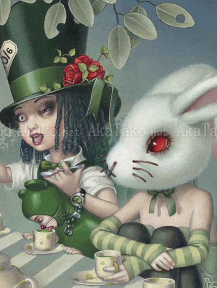 Original painting from the "Alice" book features Trevor Brown's vision of the Mad Hatter's tea party. The attendees sit at a long table under a leafy tree and enjoy the haphazard splashes of tea that may make it into their cups. Painted in 2008.