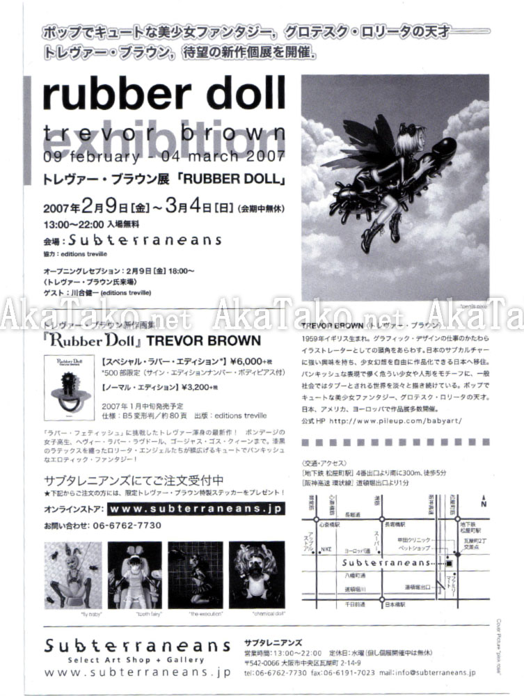Promotional flyer for Trevor Brown's Rubber Doll exhibition at Subterraneans February 9 - March 4 2007. Features the painting "Pink Rose".