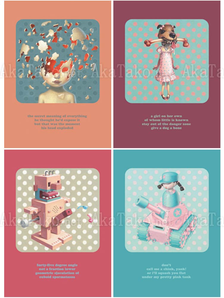 Titles of the paintings are: Iris, Goldfish, Radioactive Rabbit, Taiko, Brains, Monsters, Lora Larva, Broken Doll, Snot n Shit, Love Bombs, Polkadot Bondage, Nurse Bunny, Zelda, Lemon Kitten, Undead, Scribblehead, The Boy Whose Head Exploded, Butch, Mister Square, and Tank Girl.