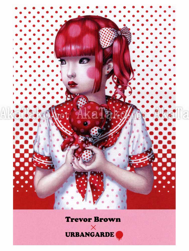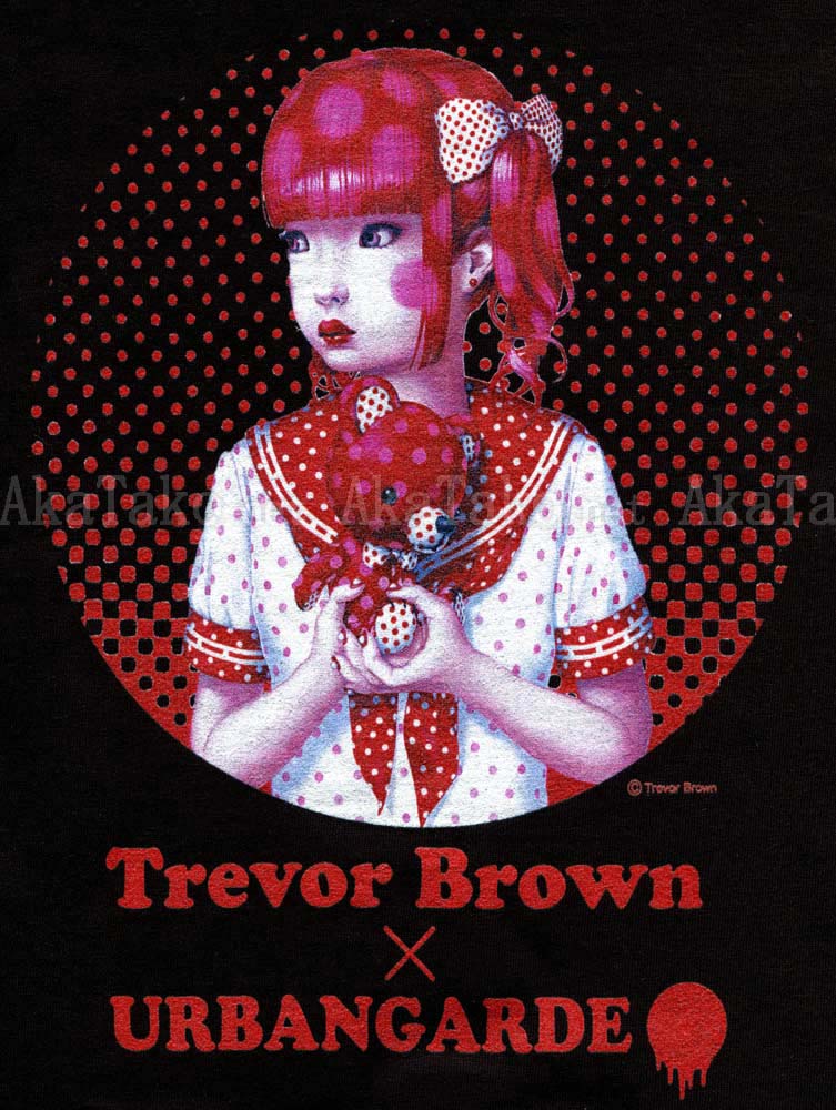 Brand new Trevor Brown X Urbangarde collaboration t-shirt features a red haired girl who loves nothing more than polka-dots. Her school girl sailor uniform is red and white (with polka dots) and her beloved teddy bear sports a polka dot pattern too. Black t-shirt comes with one postcard (last photo).