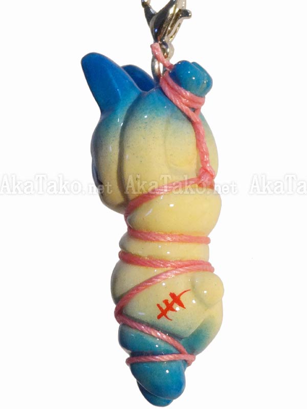 This little white bunny has baby blue ears and feet and is tied up in an irregular kikko pattern of pink rope. Kinbaku cell phone strap handmade in Japan and signed by the artist (in red on back). Comes on a paper display card as shown in second photo and has a lobster claw clasp to make attachment easier.