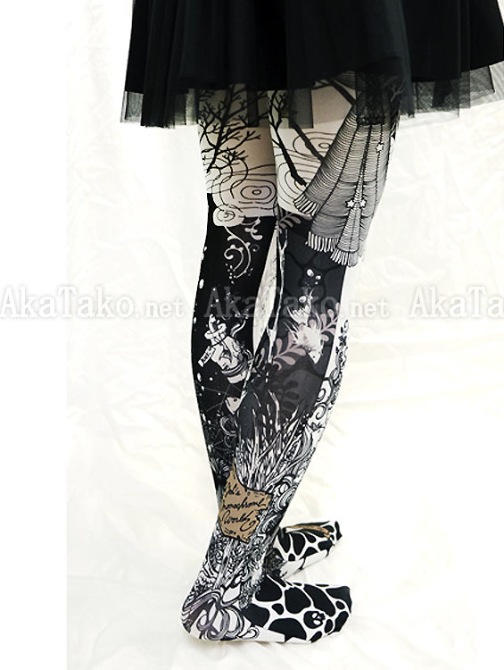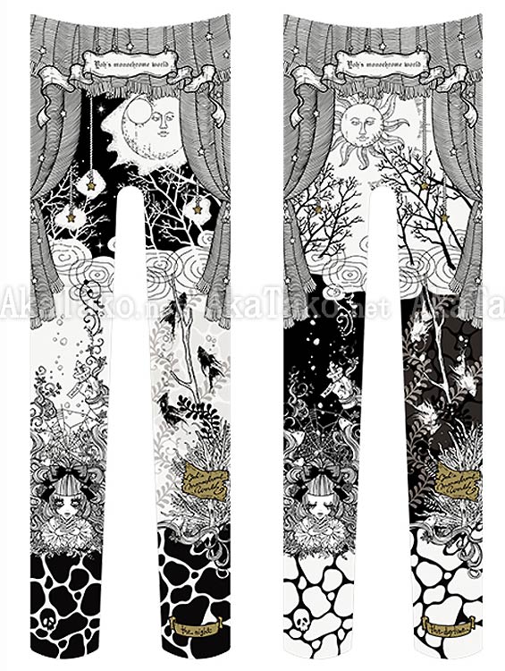 Footed tights featuring the striking black and white artwork of Yoh. The amplified light of the sun or the moon shows interesting shapes in the water. Fish, kelp, bubbles, and spiderwebs climb up your legs and are framed by a striped theater curtain at your waist. Can be worn frontwards or backwards. Tights were created as part of Yoh's "Dream Eclipse" exhibition.