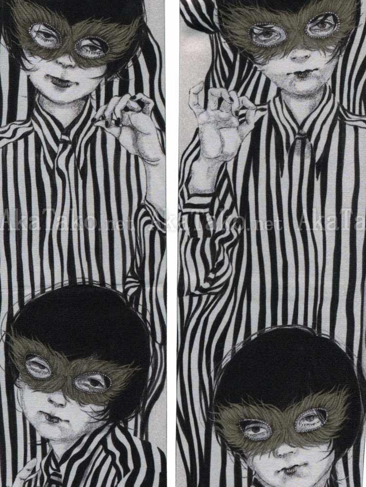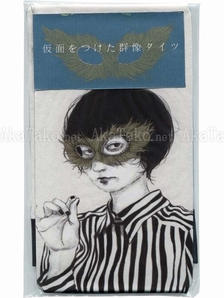 Yuka Sakuma's group of girls wearing golden feather masks and gaphic black and white striped shirts will adorn your legs in these striking tights. Can be worn frontwards or backwards.