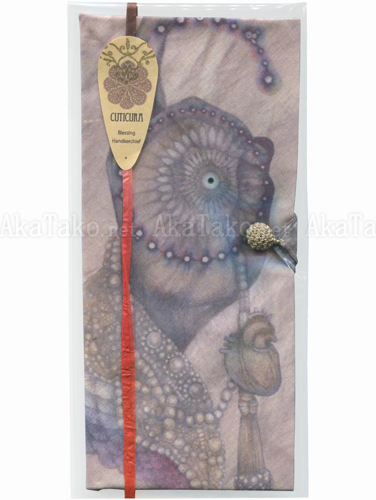 An original handkerchief designed by Yuki Onohara depicts human hands in the shape of a "6" - an image housed in the library of the Trinity Lavra of St. Sergius monastery. Beautifully packaged with one woven gold ball on a corner and a sparkling crystal in the "eye" of each hand.
