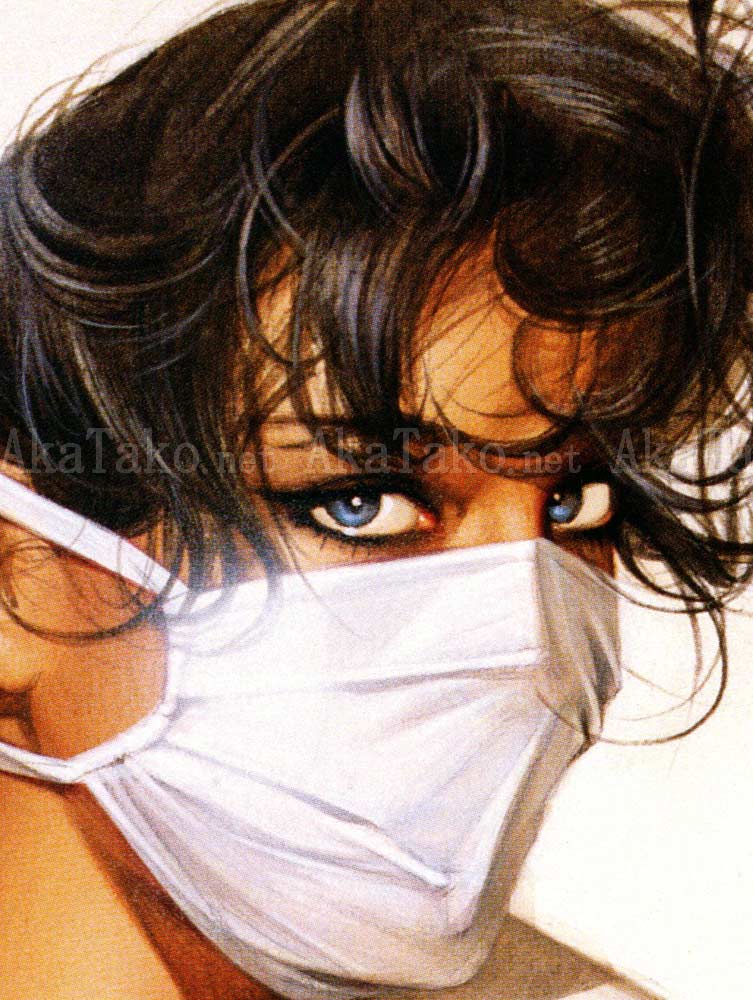 Vintage dead stock oversized print of pin-up artwork by Hajime Sorayama from the 1990s. A brunette nurse wears thigh high stockings and a garter belt under her uniform. She's ready with her stethoscope and face mask but no panties.